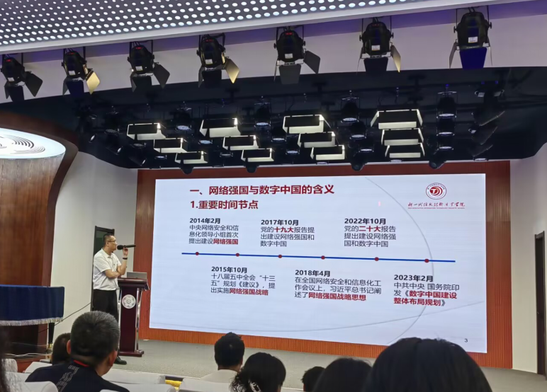 杨文虎书记从六个方面讲述了网络强国与数字中国建设与发展,强调网络安全和信息安全是事关国家安全和国家发展、事关广大人民群众工作生活的重大战略问题,要从国际国内大势出发,总体布局,统筹各方,创新发展,努力把我国建设成为网络强国。而建设数字中国是数字时代推进中国式现代化的重要引擎,是构筑国家竞争新优势的有力支撑。同时结合我院正在建设的职业院校数字校园,讲述教育数字化转型发展趋势,对标数字校园建设标准筑牢数字底座,一体化推进数字校园与数字治理的建设与应用。