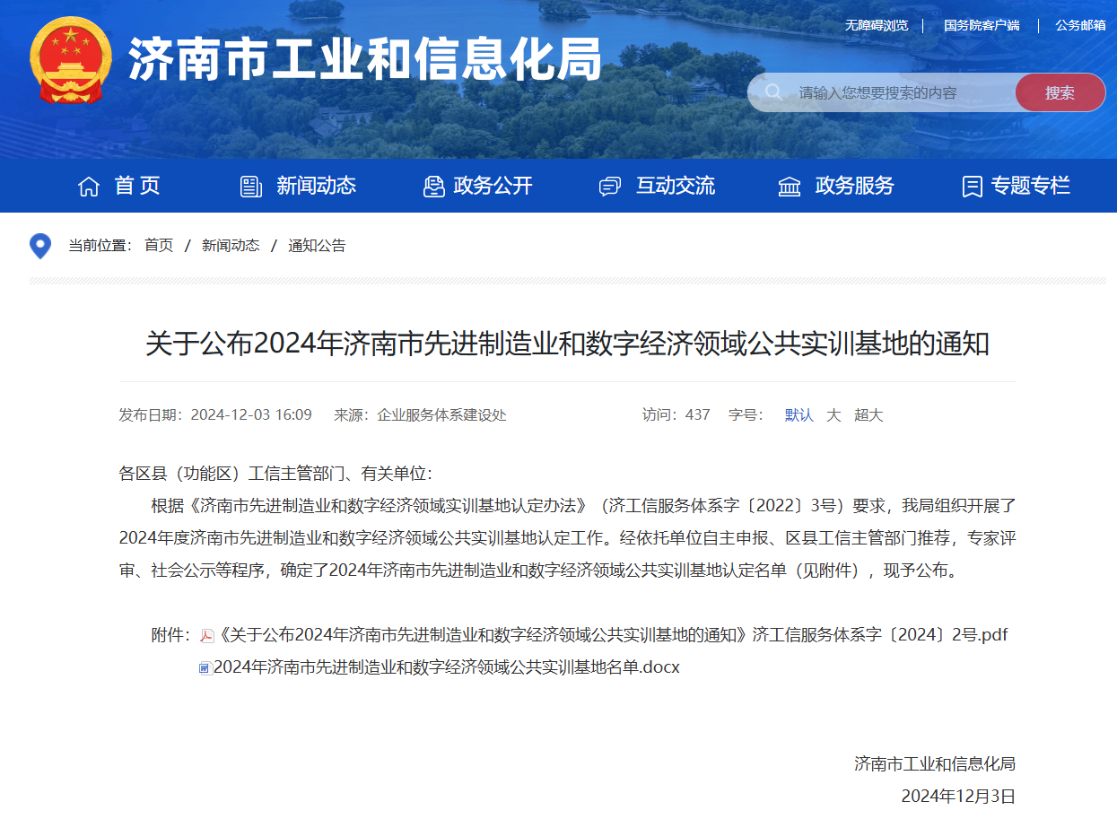 12月3日,济南市工业和信息化局公布了2024年济南市先进制造业和数字经济领域公共实训基地名单,我校申报的《虚拟现实技术公共实训项目》获准立项。