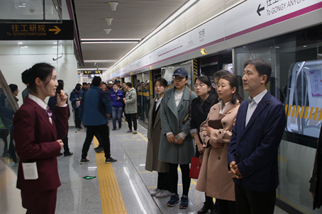 在赵营站和方特站,考察团参观了车站控制室、站务室、职工文化长廊、自动售检票设备,特别对人脸识别系统、二维码识别系统进行了详细学习。