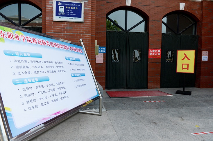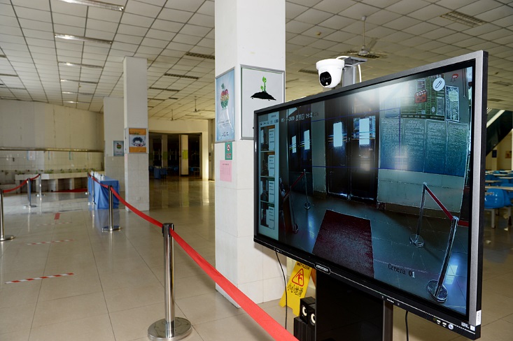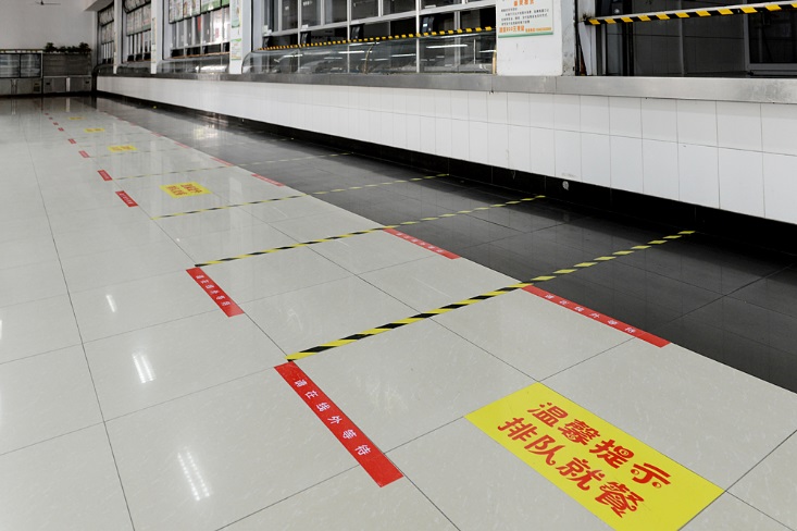在生活区,每栋公寓楼都安排有专人进行体温检测,体温正常才能进入。公寓楼内醒目位置张贴了防疫提示,提醒大家时刻做好防护。餐厅门口放置了就餐须知,安置了电子测温仪进行实时测温监控,餐厅内设置了就餐引导标识、张贴了防疫标识、设置了公共卫生手部消毒区。控制就餐人数,按系划分学生就餐地点、安排就餐时间,实行错时错峰、单人单桌用餐,避免聚集用餐。