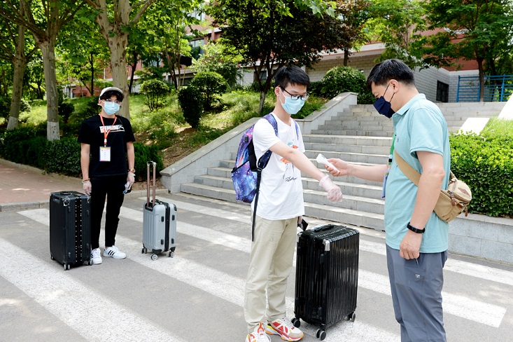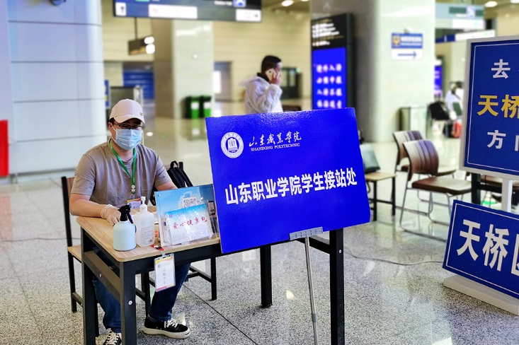 学院在济南火车站等设置了接站点,实行专人包干接站。经过信息核对、健康扫码、消毒杀菌、体温检测后,接站的老师为每一名学生送上爱心健康包,其中包括一次性医用口罩、消毒湿巾、消毒手套以及《新型冠状病毒肺炎防控指南》《疫情防控学习生活指南》《疫情防控心理健康指南》等,并帮助他们搬运行李,安排专车送至学校。