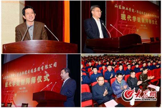 济南轨道交通集团有限公司副总经理杨晓东出席仪式并讲话,学院院长秦河为活动致辞。秦河、杨晓东代表校企签订了现代学徒制试点合作协议,秦河向带徒师傅代表颁发了聘书。集团运营公司常务副总经理李作周、集团运营公司综合管理部部长赵白雪、集团运营公司车辆部部长何延华出席活动,活动由学院副院长郭鹏主持。