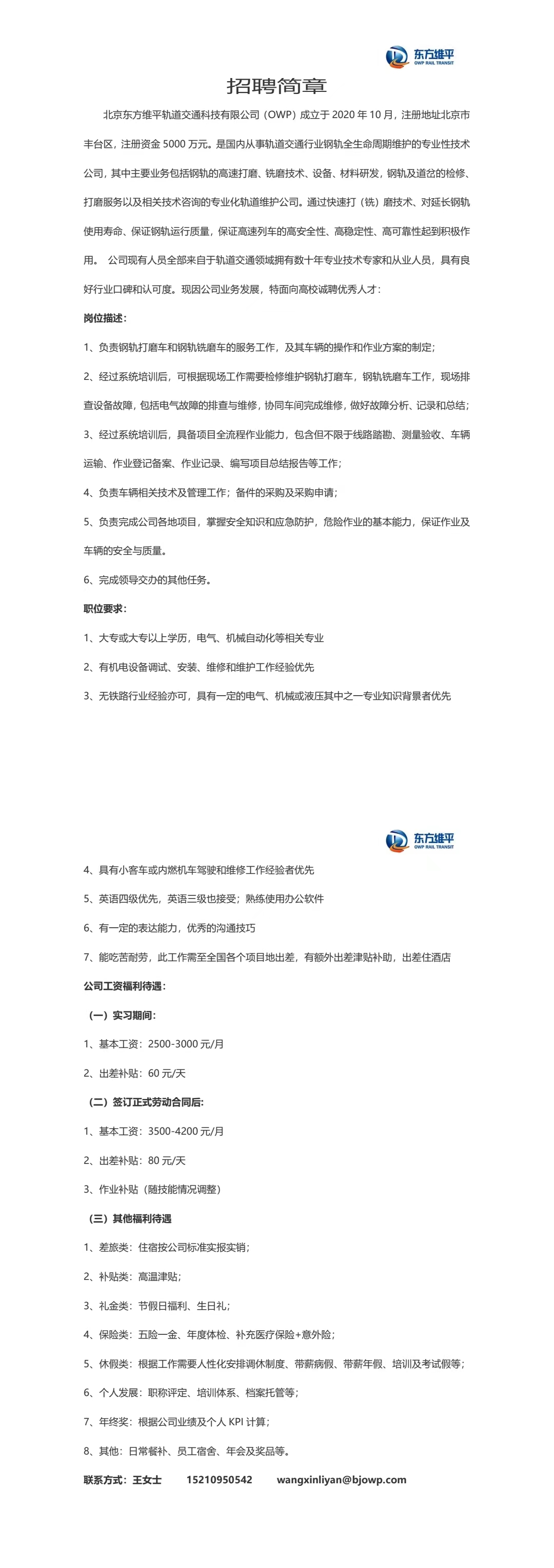 北京东方维平轨道交通科技有限公司招聘简章