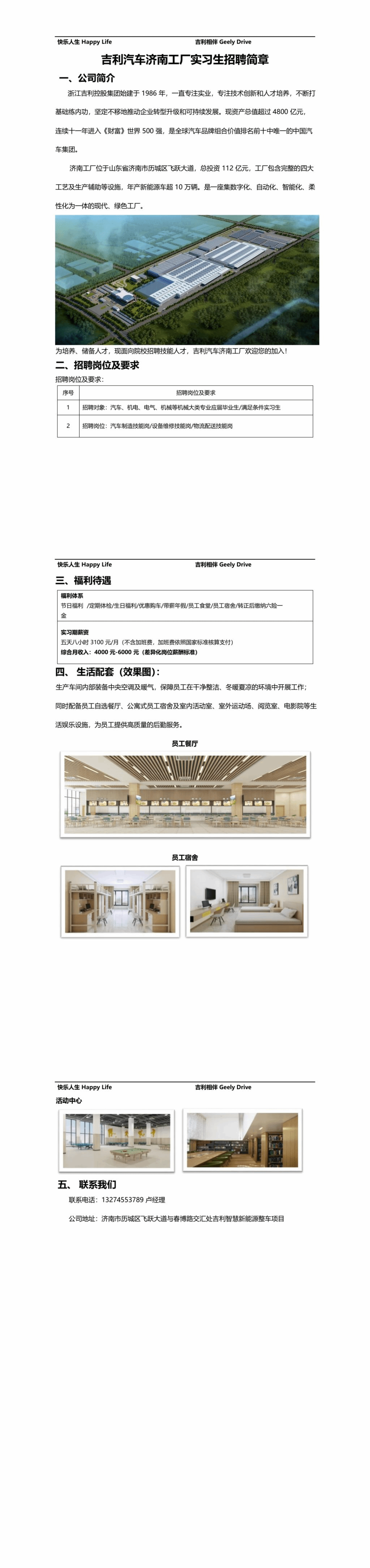 吉利汽车济南基地实习生招聘简章