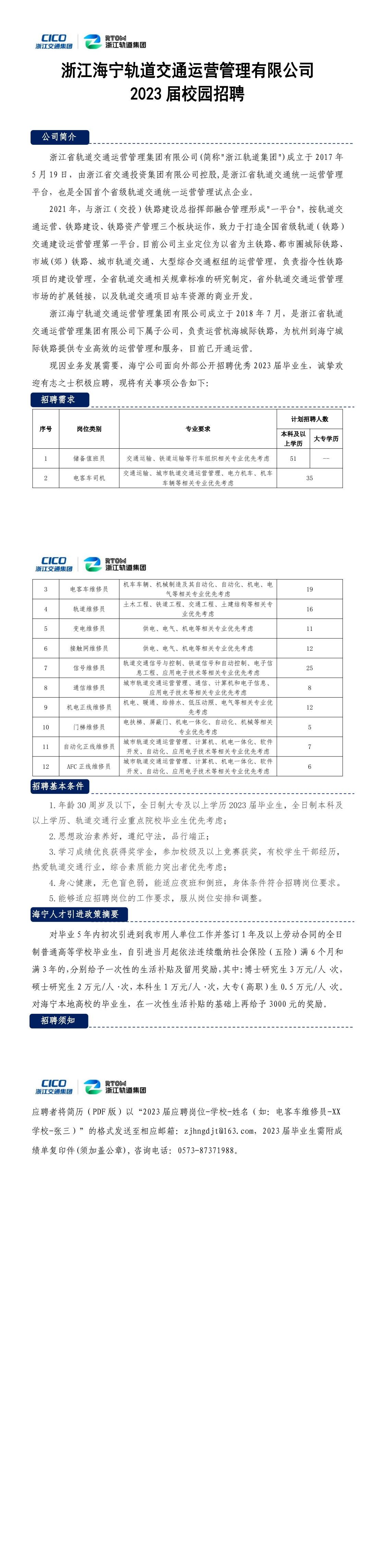 浙江海宁轨道交通运营管理有限公司2023届校园招聘