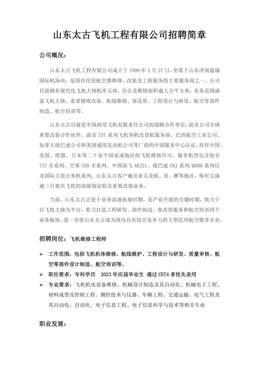 山东太古飞机工程有限公司招聘简章2023