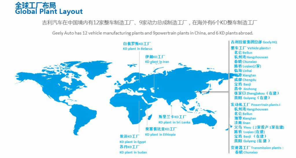 吉利控股集团在中国上海、杭州、宁波,瑞典哥德堡、英国考文垂、美国加州、德国法兰克福等地建有造型设计和工程研发中心,研发、设计人员超过2万人,拥有国内外有效专利超1.4万项。在中国、美国、英国、瑞典、比利时、马来西亚建有世界一流的现代化整车和动力总成制造工厂,拥有各类销售网点超过4000家,产品销售及服务网络遍布世界各地。