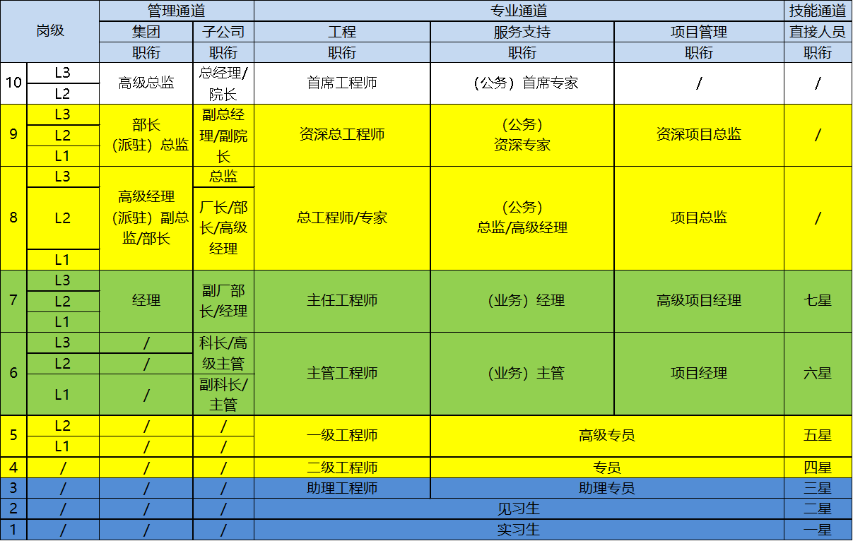 公司开辟了多通道的职业发展路径,开辟了横向和纵向的发展通道,为员工职业发展提供了更大的空间;每一层级都有任职要求及标准,实现了员工事其所好,精其所专,得其所值,知其所往。具体详见下表: