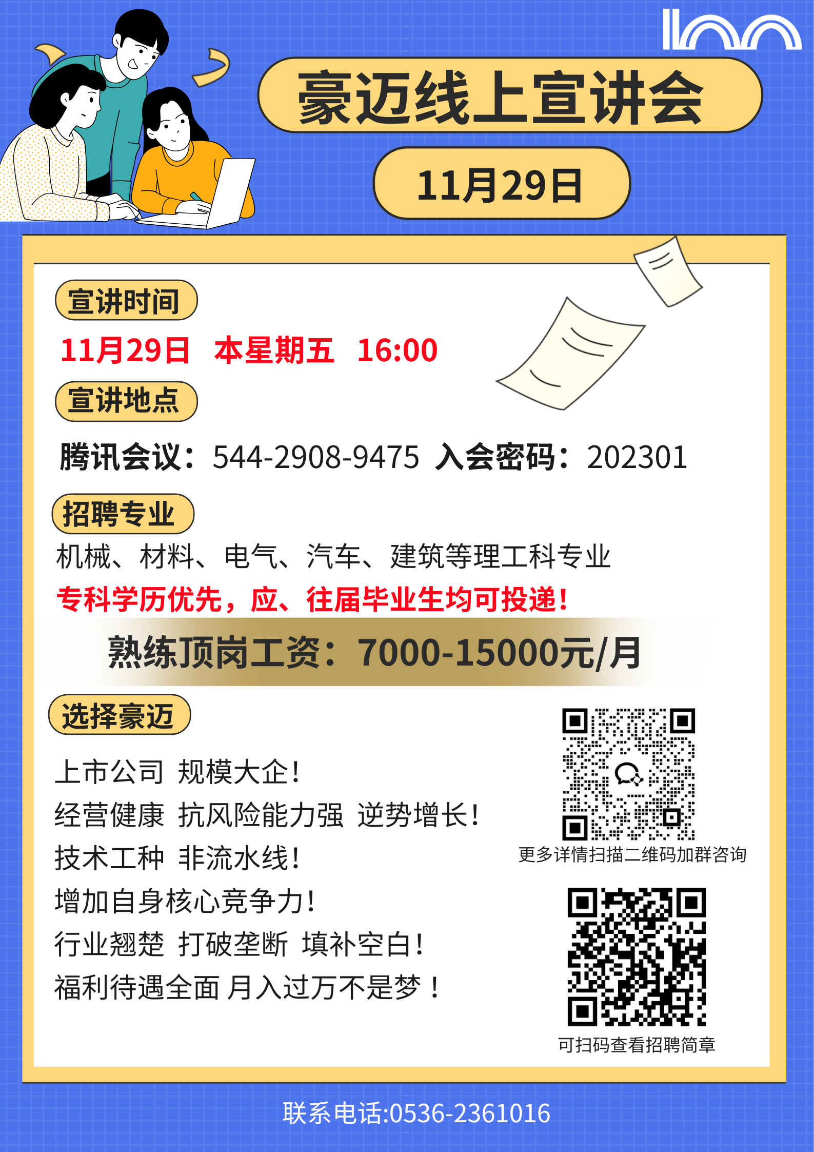 应往届毕业生不限,可关注“豪迈招聘”微信公众号,点击“高职招聘”投递简历