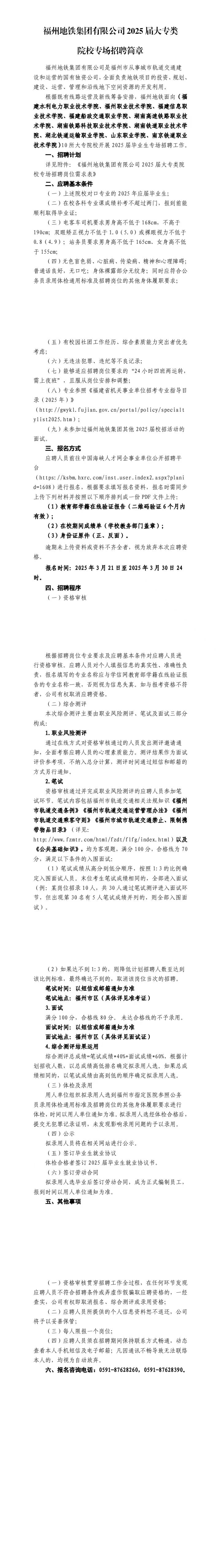 福州地铁集团有限公司2025届大专类院校专场招聘简章