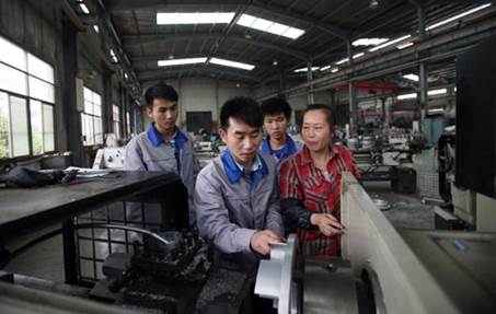 在长沙第三机床厂的车间里,20岁的湖南工业职业技术学院数控加工技术专业学生詹华为一位女工演示数控机床维护。湖南工业职业技术学院积极推广产教结合,与大型企业合作建立湖南地区的“区域技术服务中心”。由在校师生组成的技术团队承担起大型企业在湖南地区所销售机械设备的安装调试、维修维护、客户培训以及回访等工作。新华社记者 李尕 摄