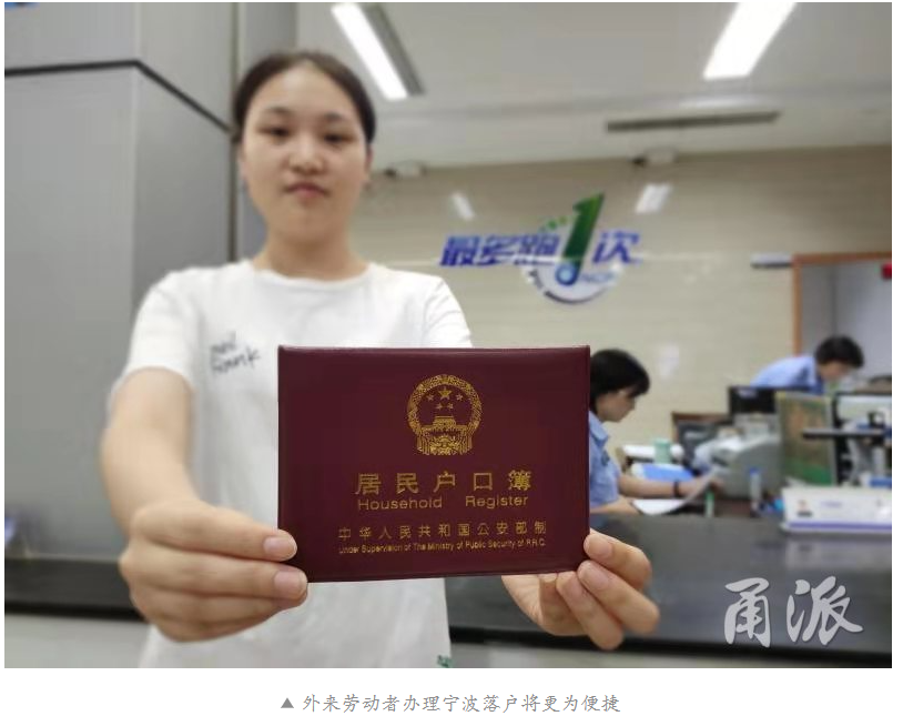 二、优化外来劳动者落户举措。进一步优化落户政策,放开放宽外来劳动者落户条件。推行长三角区域户口网上迁移,实现跨省户口迁移一地办理,实现浙东经济合作区五市部分户口迁移业务跨城通办、户籍窗口无差别办理。