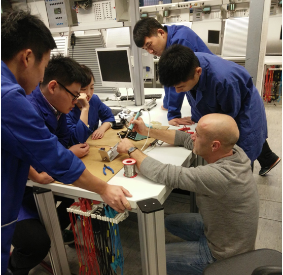 交流师生还观摩了Andreas Fellner老师PLC课程的授课,我院交流学生与德国学生组成一个学习小组,共同完成Andy老师的课程任务。尽管课程是短短的两个小时,但老师和学生充分体验了Andreas Fellner老师严谨认真的教学态度、诙谐幽默的授课方式,两位老师还和Andy老师探讨了德国先进的职业教育教学方法与组织模式等。