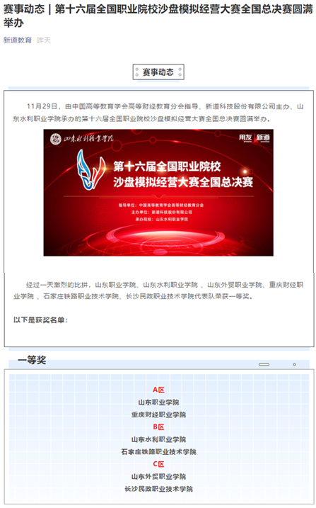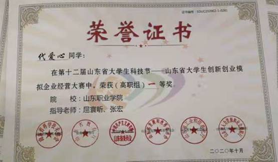 2020年11月29日,由中国高等教育学会高等财经教育分会指导、新道科技股份有限公司主办、山东水利职业学院承办的第十六届全国职业院校沙盘模拟经营大赛全国总决赛落下帷幕,本次大赛共计有59支参赛队参加全国总决赛,师生共计近400名。经过激烈角逐,全国一共评出6个一等奖,由管理学院教师屈寰昕指导的我院代表队荣获一等奖,这是自2015年我院开展创新创业教育以来,首次在全国职业院校沙盘模拟经营大赛中打进国赛,并首次获得国赛一等奖。
