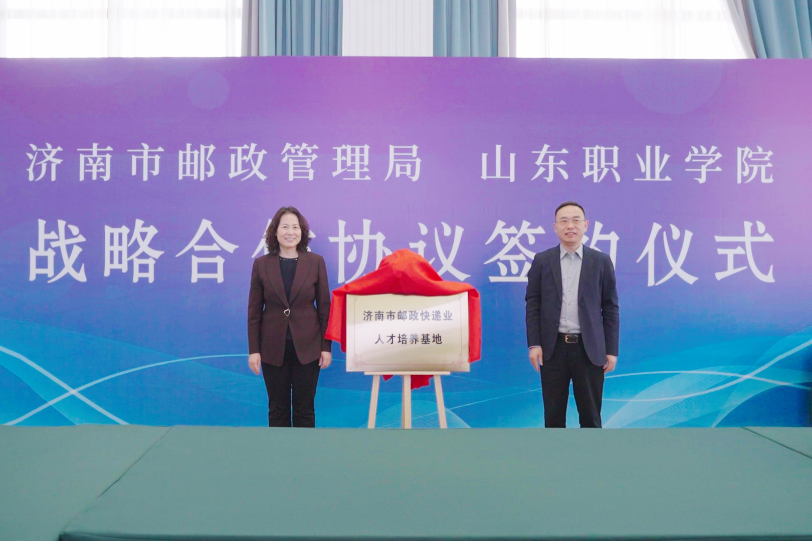 韦德忠、赵凤文代表双方为“济南市邮政快递业人才培养基地”揭牌。