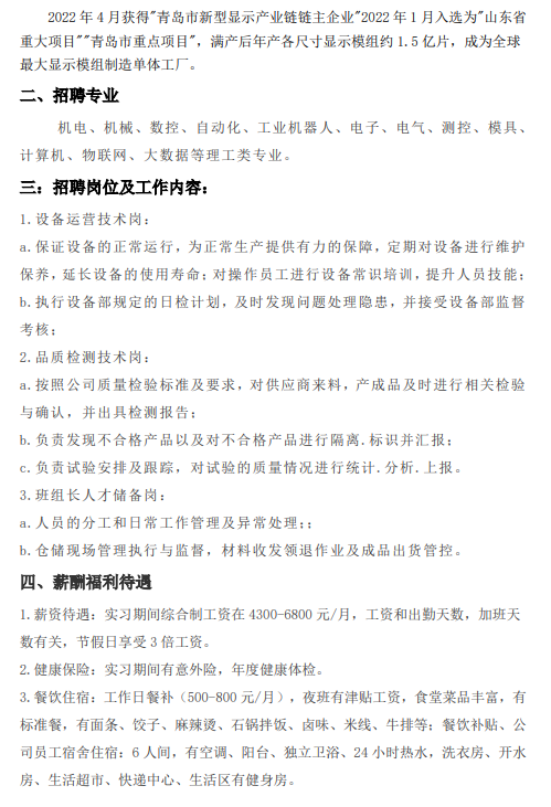 青岛京东方光电科技有限公司校园招聘简章