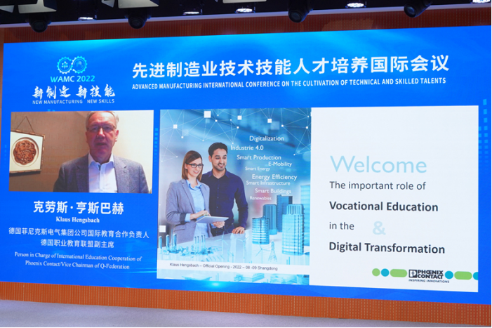 山东省教育厅职业教育处处长王志刚;德国巴登符腾堡州教育部专家、德国戈特利布·戴姆勒学院数据科学学院院长安德烈亚斯·威尔斯坦;德国菲尼克斯电气集团公司国际教育合作负责人/德国职业教育联盟副主席克劳斯·亨斯巴赫;中国智能制造专委会专家/e-works数字化企业网总编、CEO黄培;德国菲尼克斯电气中国公司副总裁、总工程师/中国自动化学会理事杜品圣;美国普渡大学材料科学与工程专业教授王晓明;德国国家科学与工程院院士葛兴福通过线下与线上方式作了精彩的专题报告。