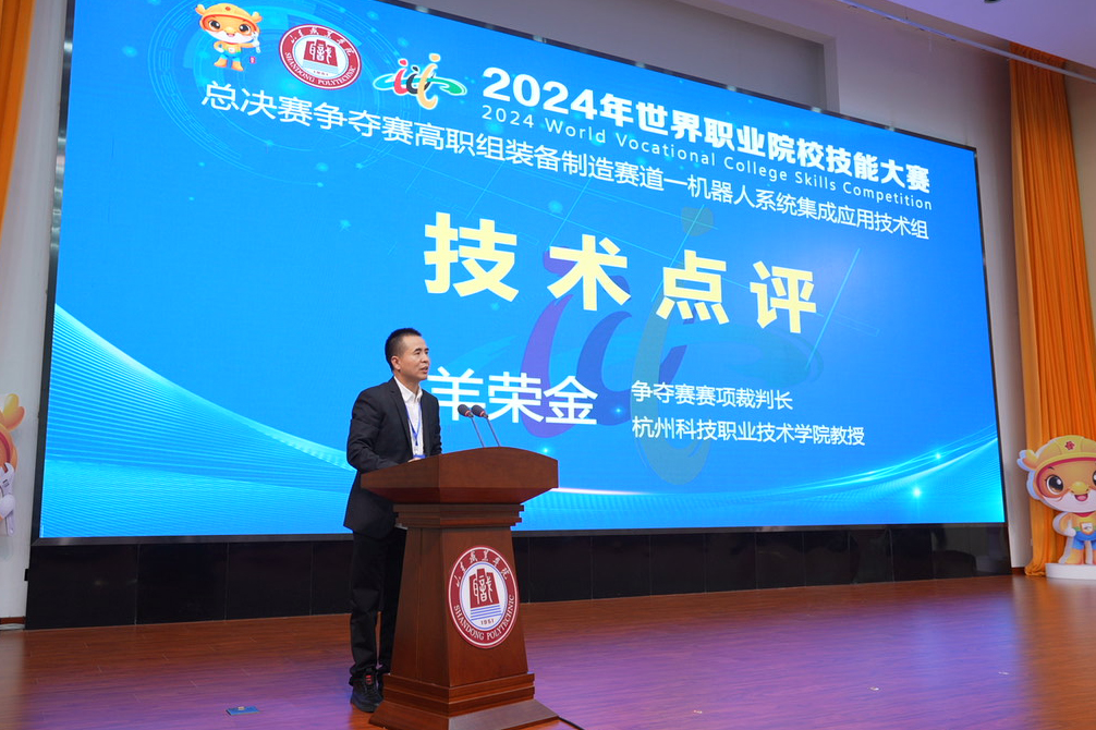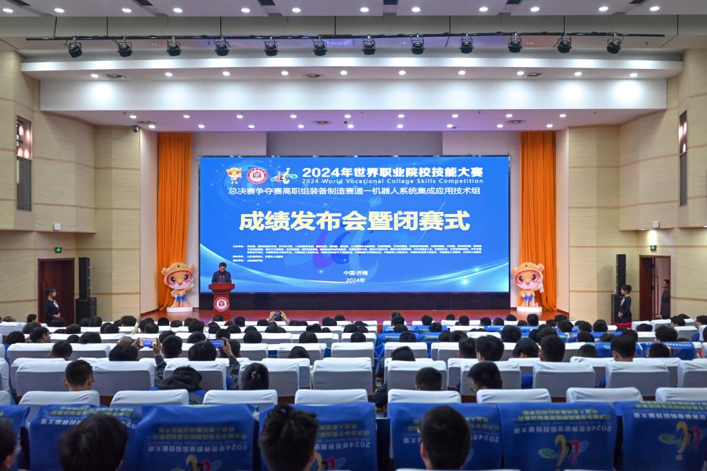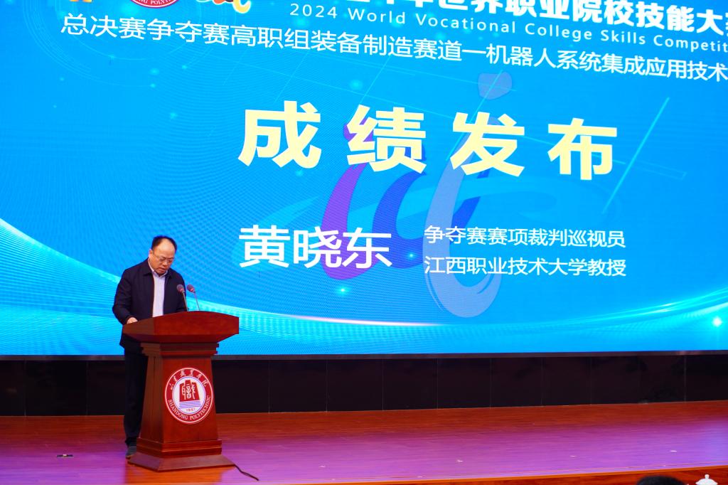 11月1日,2024年世界职业院校技能大赛总决赛争夺赛高职组“机器人系统集成应用技术”赛项成绩发布会暨闭赛式在我校图书行政楼西报告厅举行,党委书记、赛区执委会委员赵凤文,赛项裁判长羊荣金、裁判巡视员黄晓东、纪律监督组长纪付荣等出席。各代表队领队、参赛师生等参加闭赛式。成绩发布会暨闭赛式由副院长李新华主持。