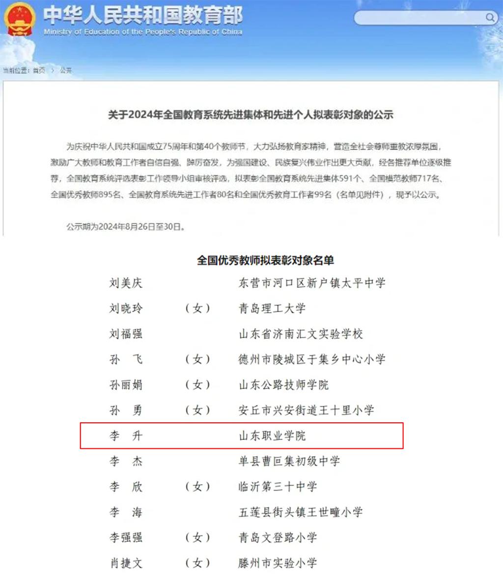 日前,教育部、人力资源社会保障部公示了2024年全国教育系统先进集体和先进个人表彰对象名单。我校智能制造学院李升荣获“全国优秀教师”称号。