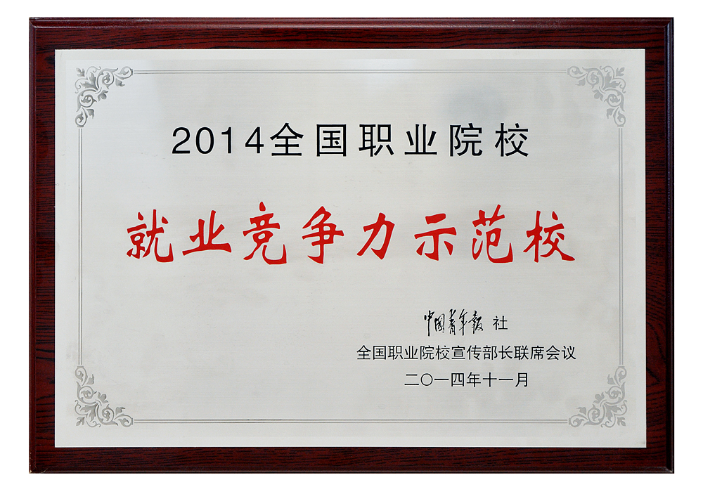 2014全国职业院校就业竞争力示范校”推选活动由中国青年报社、全国高职高专校长联席会议、全国职业院校宣传部长联席会议主办,中青在线、中国高职高专教育网提供网络支持,参选对象为全国高职高专院校。活动从推荐名单中遴选出30家高职院校获得“2014全国职业院校就业竞争力示范校”称号,授予“2014全国职业院校就业竞争力示范校”牌匾。
