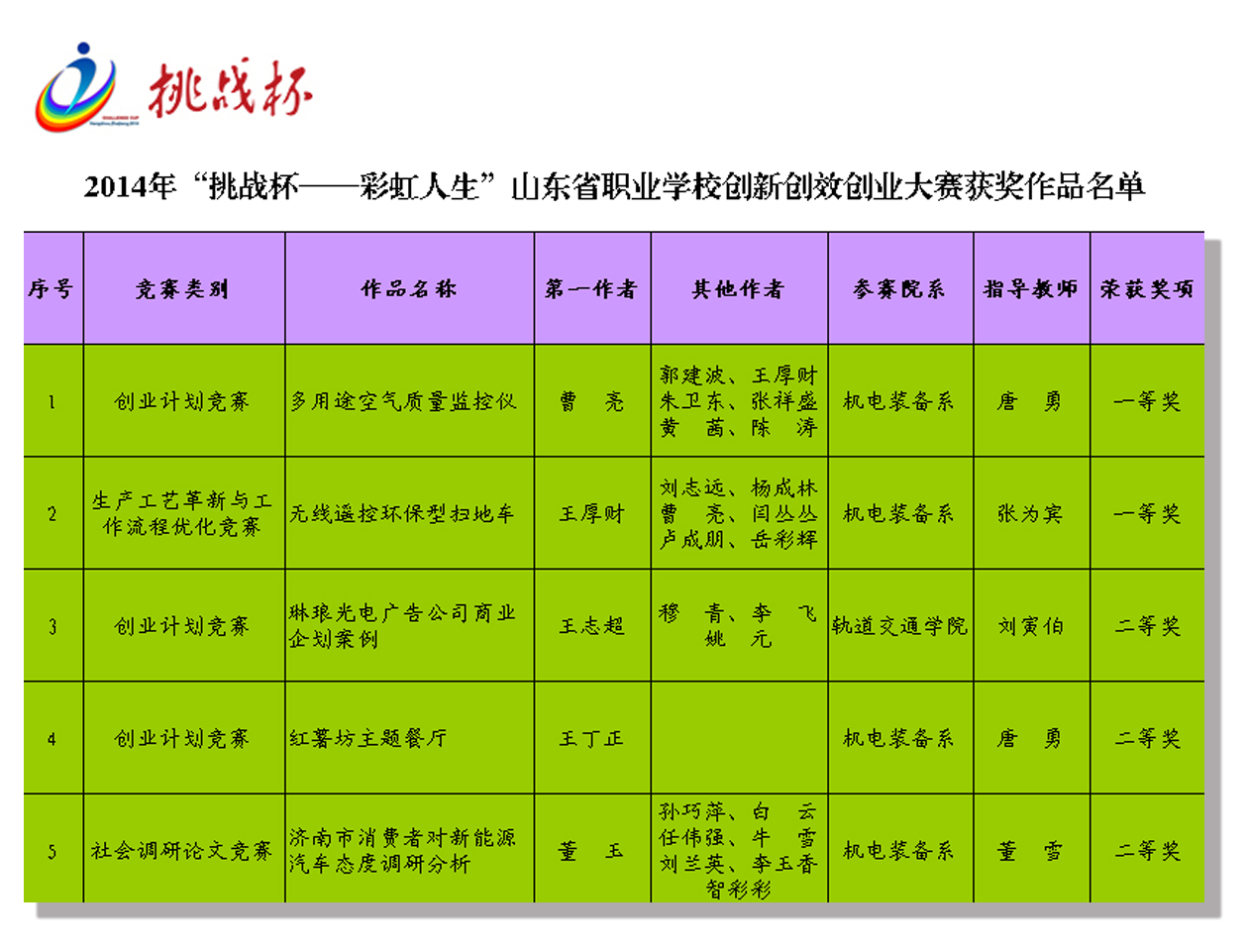 近日,由共青团山东省委、山东省教育厅、省科协、省学联联合主办的2014年“挑战杯——彩虹人生”全省职业学校创新创效创业大赛(复赛)在济南举行。经大赛评审委员最终评定,我院报送的《多用途空气质量监控仪》、《琳琅光电广告公司商业企划案例》、《济南市消费者对新能源汽车态度调研分析》等五项参赛作品分别荣获一等奖2项、二等奖3项。其中《多用途空气质量监控仪》、《无线遥控环保型扫地车》两项作品还将代表山东省参加7月份在杭州举行的全国职业学校创新创效创业大赛总决赛。