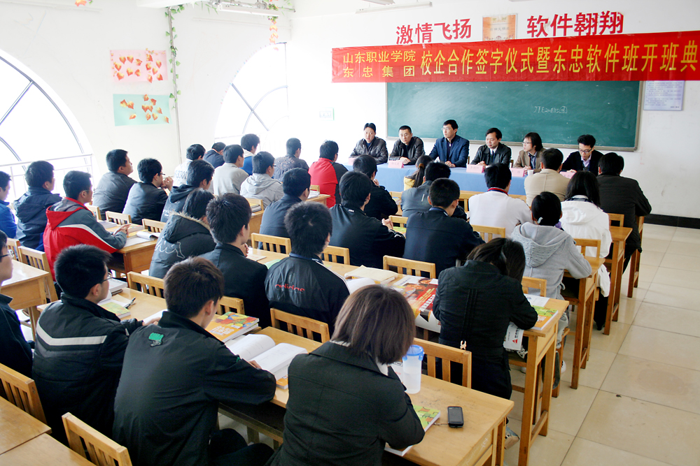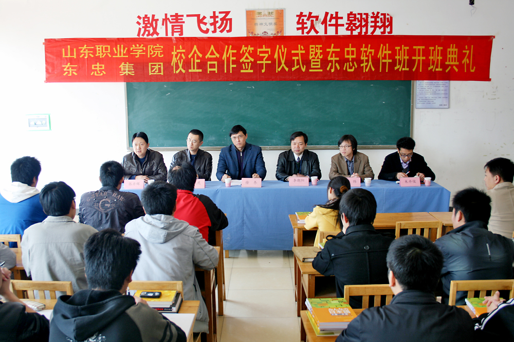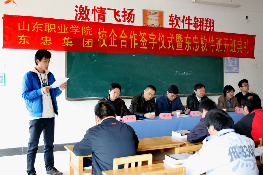东忠集团1996年成立于日本东京,是一家以计算机软硬件自主研发、生产、销售为一体的高科技企业。以日本东忠为基础,先后成立了杭州东忠、济南东忠、上海东忠;并与诸多世界500强企业建立了长期而稳定的业务合作关系。旗下杭州东忠科技有限公司是2009年度全国软件外包100强企业。济南东忠软件有限公司是一家主要从事对日软件外包和IT服务的高新技术企业。随着集团规模的扩大和发展战略的调整,济南东忠将作为集团在中国的第二开发基地重点发展。东忠集团力争五年内发展到5000人的技术队伍规模,济南东忠将会承担其中一半以上的发展任务。信息工程系抓住软件服务外包产业和东忠集团超速发展的历史机遇,与东忠集团建立校企合作并组建东忠软件班。合作班的学生主要来自于2009级软件技术和计算机应用技术专业。合作班采用企业课程体系,聘任企业经验丰富的项目工程师授课,利用企业真实项目开展实训。实训结束后,直接进入企业实习和就业。本次校企合作班的建立将有效地缩短了学校教育与企业需求之间的距离,打通了学生高质量对口就业通道。