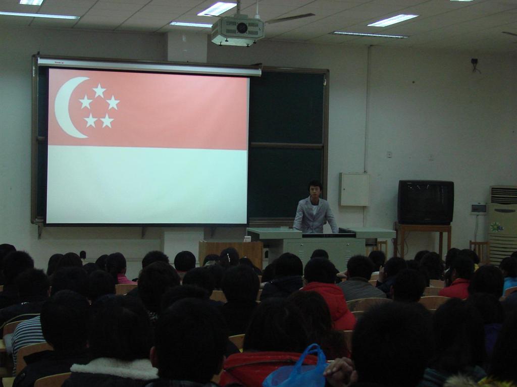 会上,唐波、谭强等5位赴新加坡顶岗实习刚归国不久的07级学长为大家做了精彩的报告,讲述了半年实习亲身感受和体验,与同学们分享收获和喜悦。同学们均是提前到场,认真聆听。学长们就新加坡国家概况、就业情况及他们自身的工作状况为大家做了详细的讲解,那里幽美的生活环境、完善的工作体系让同学们向往不已。大家纷纷提问,与学长们就自我发展、手续办理、所学所见、薪酬待遇等方面进行了交流。他们“去了是半年的坚持,不去是一生的遗憾”的总结让大家受益匪浅,场下掌声不断。