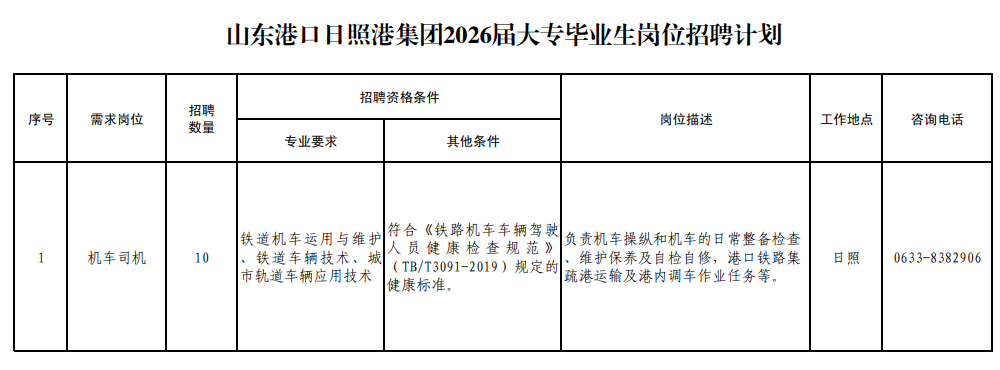 附件:1.山东港口日照港集团2026届大专毕业生岗位招聘计划