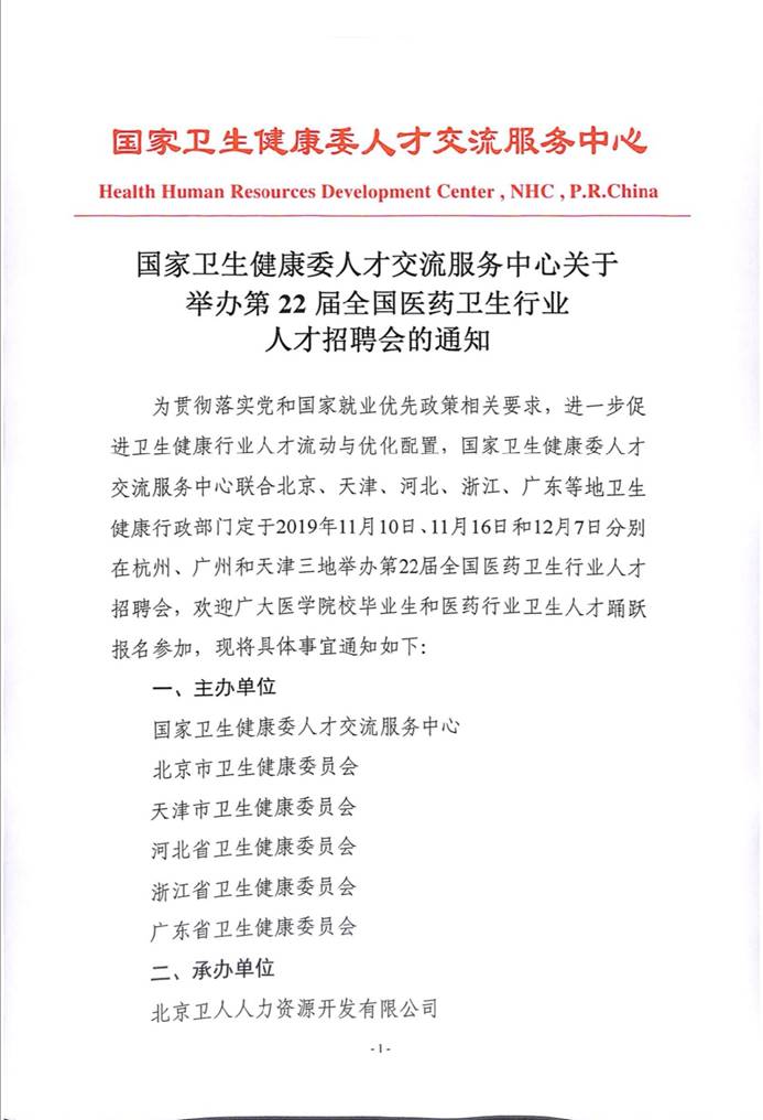 国家卫生健康委人才交流服务中心关于举办第22届全国医药卫生行业人才招聘会的通知