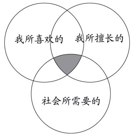 现在,你需要将自己的角色彻底转变,从毫无顾忌的梦想主义者转变为严厉、冷静、理性的现实主义者。你要遵循“三个圈法则”对职业清单进行筛选,过滤掉那些不符合此法则的项目。“三个圈法则”示意图如下: