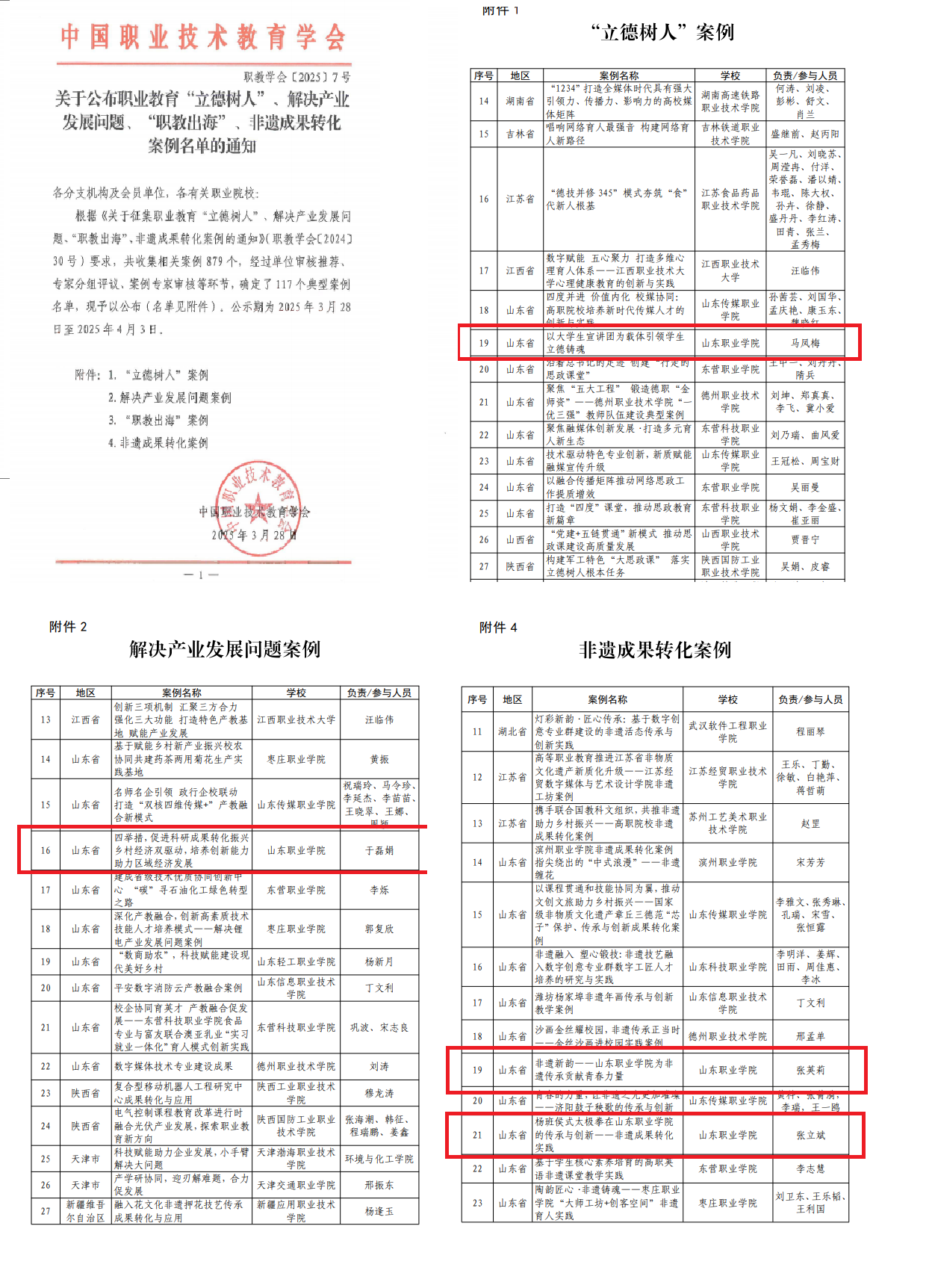 此次中国职业技术教育学会共征集职业教育“立德树人”、解决产业发展问题、“职教出海”、非遗成果转化相关案例879个,经过单位审核推荐、专家分组评议、案例专家审核等环节,确定了117个典型案例名单。其中,我校入选“立德树人”案例1项、解决产业发展问题案例1项、非遗成果转化案例2项。