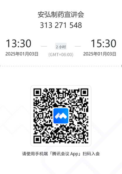 各位大三同学,齐鲁制药分公司安弘制药,预定1月3日下午开展线上宣讲,请各位大三同学一定抓住机会,按时参加,开始时间是2点,请大家1点45分进入会议号等待。