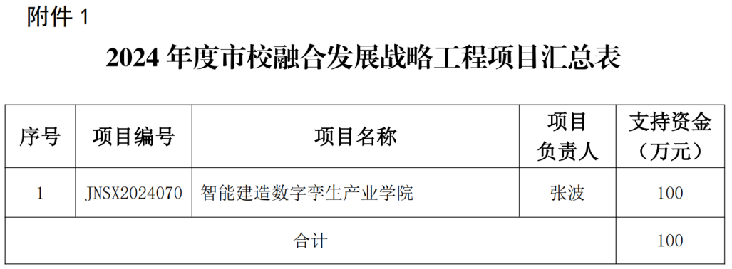 近日,济南市教育局发布了《2024年度济南市市校融合发展战略工程项目立项通知》,由我校土木工程学院牵头申报的“智能建造数字孪生产业学院”获批立项,支持资金100万元。