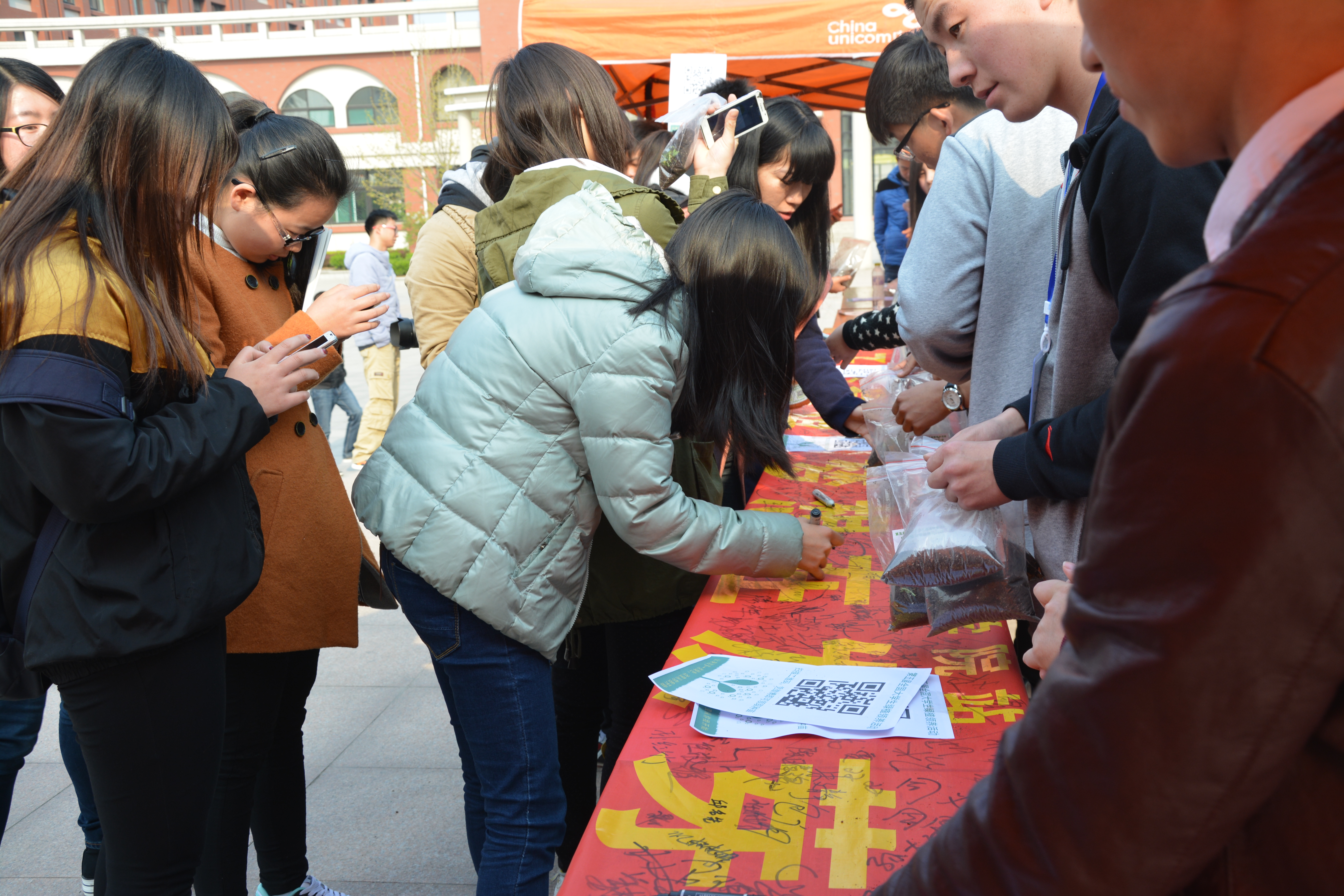 9日下午,志愿者们在喷泉广场免费向大学生派发绿植种子,同学们通过扫描二维码参与活动报名,凭借报名成功后自动分享的公益微博,在活动现场领取种子,参与环保种植行动。同时,现场还邀请同学们将微博发送的种子成长宣言写在便签条上,贴到现场准备的展示版上进行展示,与参与活动的同学们共同分享。