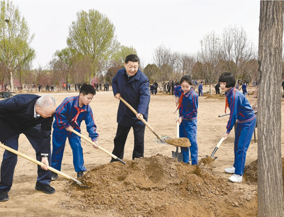 4月8日,党和国家领导人习近平、栗战书、汪洋、王沪宁、赵乐际、韩正、王岐山等来到北京市通州区永顺镇参加首都义务植树活动。这是习近平同大家一起植树。要践行绿水青山就是金山银山的理念,推动国土绿化高质量发展,统筹山水林田湖草系统治理,因地制宜深入推进大规模国土绿化行动,持续推进森林城市、森林乡村建设,着力改善人居环境,做到四季常绿、季季有花,发展绿色经济,加强森林管护,推动国土绿化不断取得实实在在的成效。