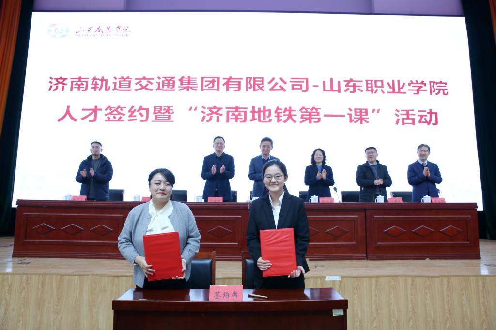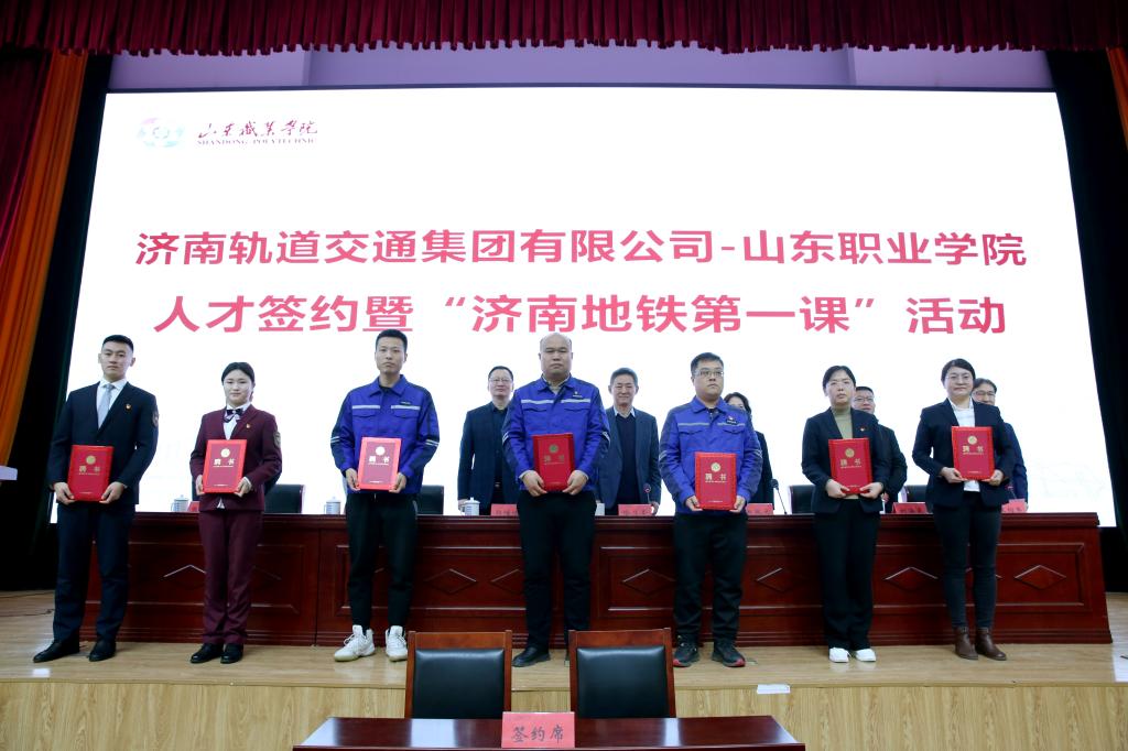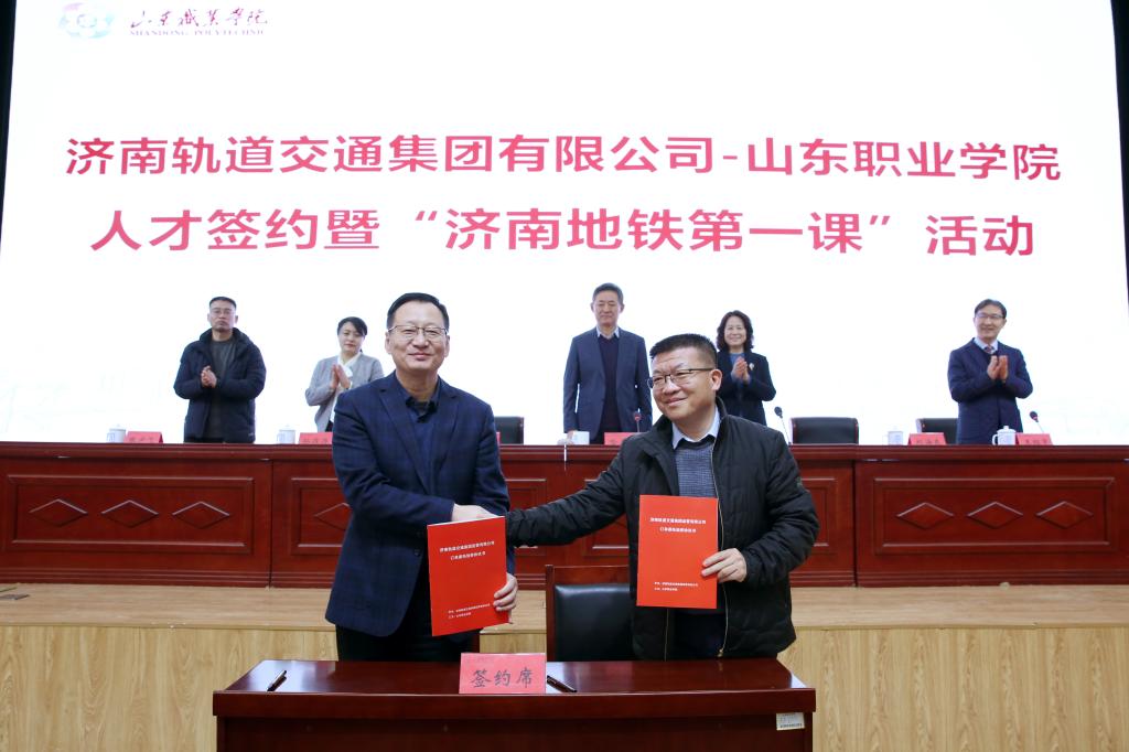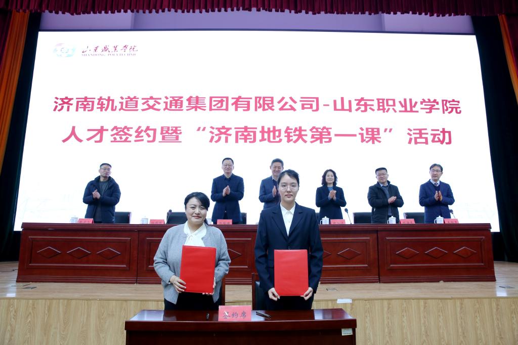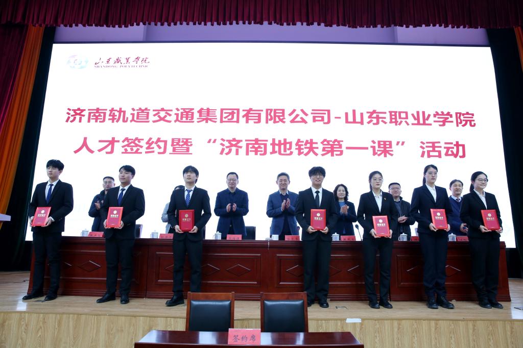 为进一步深化产教融合、校企合作,1月12日,济南轨道交通集团有限公司与我校举行人才签约仪式暨“济南地铁第一课”活动。济南轨道交通集团党委委员、副总经理哈月亭,济南轨道交通集团副总工程师、运营公司党委书记刘海东,济南轨道交通集团运营公司党委副书记、工会分会主席孙存存,我校党委书记赵凤文、院长郭培谦、副院长张少飞出席活动。活动由副院长王绍军主持。