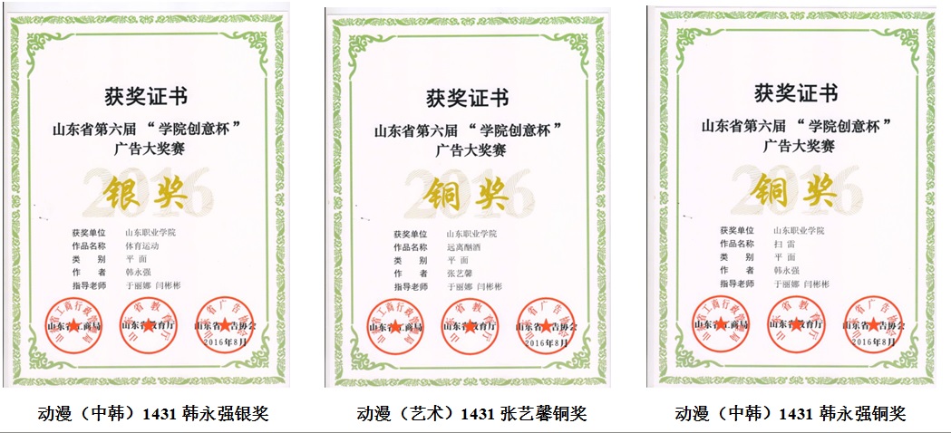 在今年的山东省第六届“学院创意杯”广告大奖赛中,我院铁道信号与信息工程系动漫专业学生在在专业教师于丽娜的精心指导下,获得银奖1项、铜奖12项、优秀奖9项佳绩,学院被授予优秀组织奖。此外,此次铜奖以上作品还共获得7000元大赛奖励。