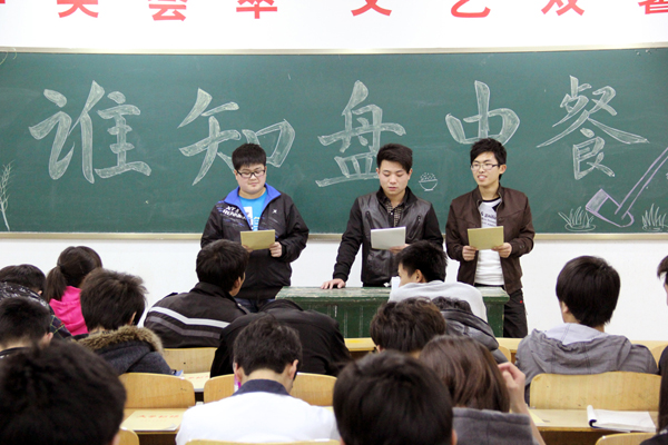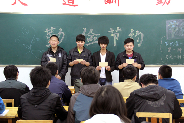 班会上,各班同学通过诗歌朗诵、访谈交流、节俭小故事等多种形式让同学们深入了解了勤俭节约的重要性。其中有位同学说也许现在我们改变不了社会中