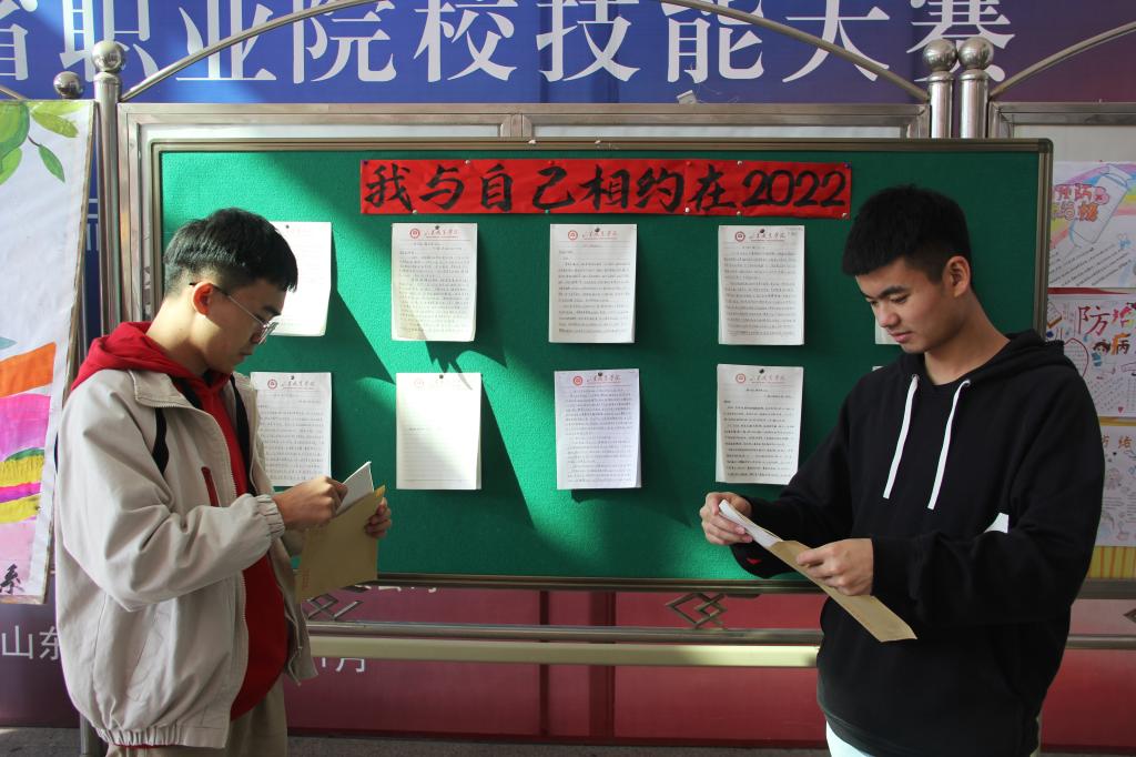 活动结束后,选出10篇有代表性的作品,制成展板,摆放在九号楼一楼大厅,供同学们参观学习,并为同学们精心准备了信封,将他们的信密封保存三年,三年后在交到他们手中,希望同学们三年后看到这封信时,能够回忆起自己大学三年的点点滴滴,不忘初心与梦想。