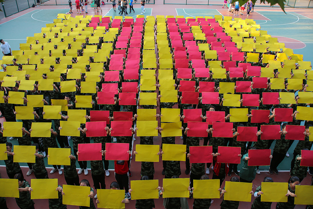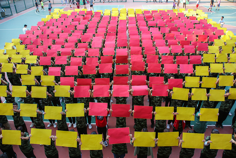 新生们通过手中红黄两面方形板的交替翻转,随着音乐的节奏和变换不停翻动着,依次摆出“1949” “2019” “70” “我” “爱心” “中国”等图案,献礼新中国成立70周年。