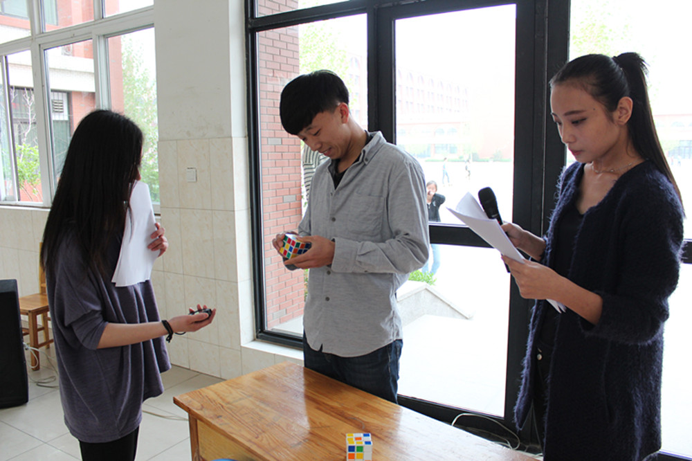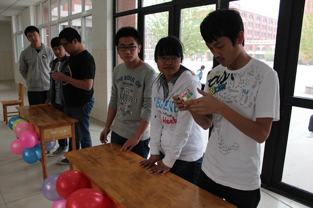 第一届魔方比赛顺应潮流,同时也为广大魔方爱好者提供一个交流的平台,为魔方高手们搭建了一个表演舞台。学生会主席穆青、社团部部长吴琪和魔方协会会长张耀宸也来到了现场为选手鼓劲。此次魔方比赛于4月10日下午开赛,首先由DOD街舞协会来表演开场舞,随后主持人宋永康、李哲宣布魔方比赛开场。本次比赛由个人赛、团队赛、疯狂赛组成,经过初赛复赛决赛激烈的比拼,陈同鑫同学技压群雄,脱颖而出,以45秒44的复原三阶魔方速度夺得了比赛冠军。比赛最后,穆青也即兴表演了快速拼魔方,并以45秒56的好成绩劲爆全场。 此次的比赛在工作人员的认真负责与有序分工配合以及参赛者的激情高涨下圆满举行,在参赛者双手变幻莫测地转动下,魔方已经不再是一种玩具,而是作为一项训练手眼协调,提高记忆力的运动深入人心。魔方也日益活跃在同学们的业余生活中丰富开展起来。