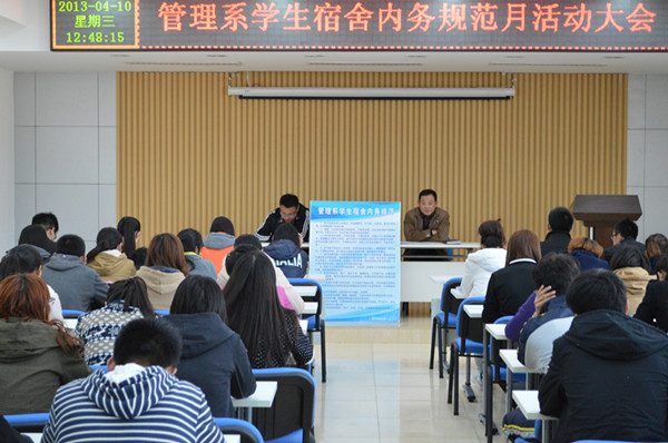 为营造一个健康的校园生活环境,提高同学们自觉维护宿舍公共卫生的能力,管理系于4月10号举行“学生宿舍内务规范月”活动动员大会。管理系学工办主任栾金志出席大会。