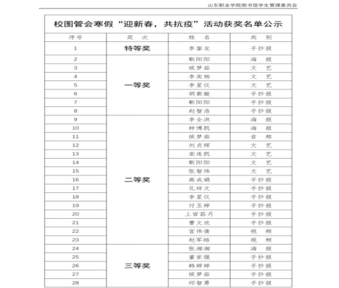 本次活动以手抄报,音频,视频,海报,文字等多种形式开展。经过精心准备,为大家营造了参赛的良好氛围。同学们积极参加活动。为疫情下的人们送去温暖的问候。本次评选活动也展现了同学们对疫情的关心和对抗疫人员的敬畏之情。最后大赛设置了特等奖,一等奖,二等奖,三等奖的奖项设置。获奖名单如下所示: