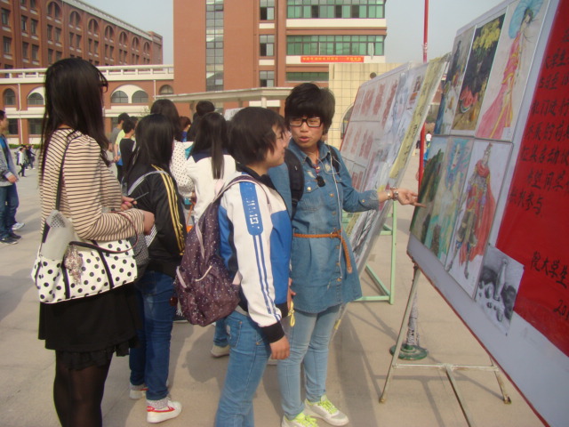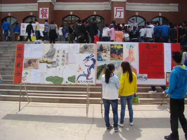 午时12时餐厅北门人山人海,老师、同学们被作品深深吸引,留住脚步驻足欣赏,本次艺术展学生表现出高涨的热情,纷纷积极投稿,作品形式多样,其中包括摄影,优秀的摄影作品用一种沉默的方式与观众进行四线和精神上的交流。向前观望,那些书法作品把我们带回了书法艺术的殿堂,清劲有力的楷书,潇洒飘逸的行书,端正大方地隶书,无不给我们带来一种陶冶心灵的享受。绘画展区里有鲜艳的水粉画,不仅让人感慨一双手、一支笔能画出如此神奇的世界。