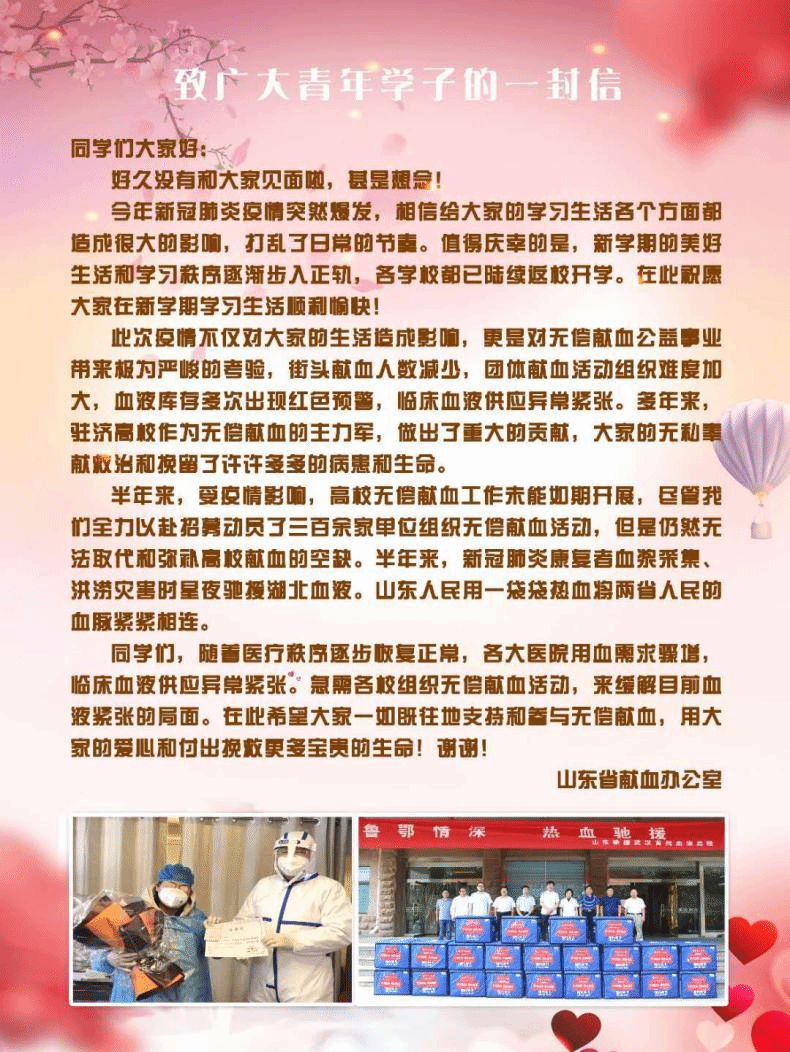 近期我校无偿献血服务队与山东省红十字血液中心将共同举办大型的公益献血活动,在疫情防控期间,全省血液出现紧缺。在目前人造血液尚不能完全代替人体血液之时,临床用血只能靠健康人体捐献,而现在正是需要大家积极献血的时候。请广大师生奉献出自己的一份爱心!