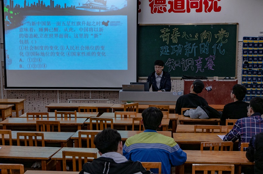 竞赛中,选手们集中坐在台下,对荧幕上的随机出现的竞赛题目进行书面作答。整个过程中教室内极为安静,只能听见同学们书写的“刷刷”声,比赛时间不长,但每位选手都在这短暂的时间里用尽自己的全部思绪对题目进行一一作答。通过本次竞赛,同学们纷纷表示加深了对习近平新时代中国特色社会主义思想的理解,提高了责任意识和担当意识,增强了历史使命感,在今后的日子里要更加积极的响应组织的号召,团结一心,并肩向前。