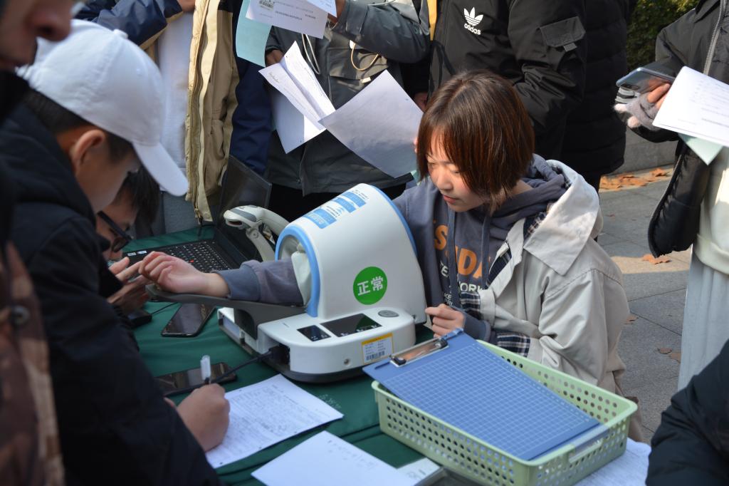 以爱心彰显青春之美,用奉献引领时尚之路。活动现场,献血的同学们源源不断,无偿献血车和踊跃献血的同学成为我院一道亮丽的风景。志愿者们精神饱满迎接每一位献血的同学。在活动开始前,已有不少学生早早等待献血,采集登记处很快便排成了一条长龙。在医护工作人员和大学生志愿者的协助下,填表、化验、等候、抽血、休息,一切工作都有条不紊。