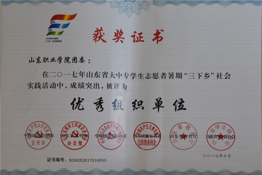 近日,共青团山东省委下发通知,对2017年度全省共青团工作、大中专学生暑期“三下乡”社会实践先进集体和个人进行表彰,我院6支团队、8名教师、20名同学被授予荣誉称号,学院团委被评为2017年度“山东省先进团委”,至此我院已连续四年获此殊荣。