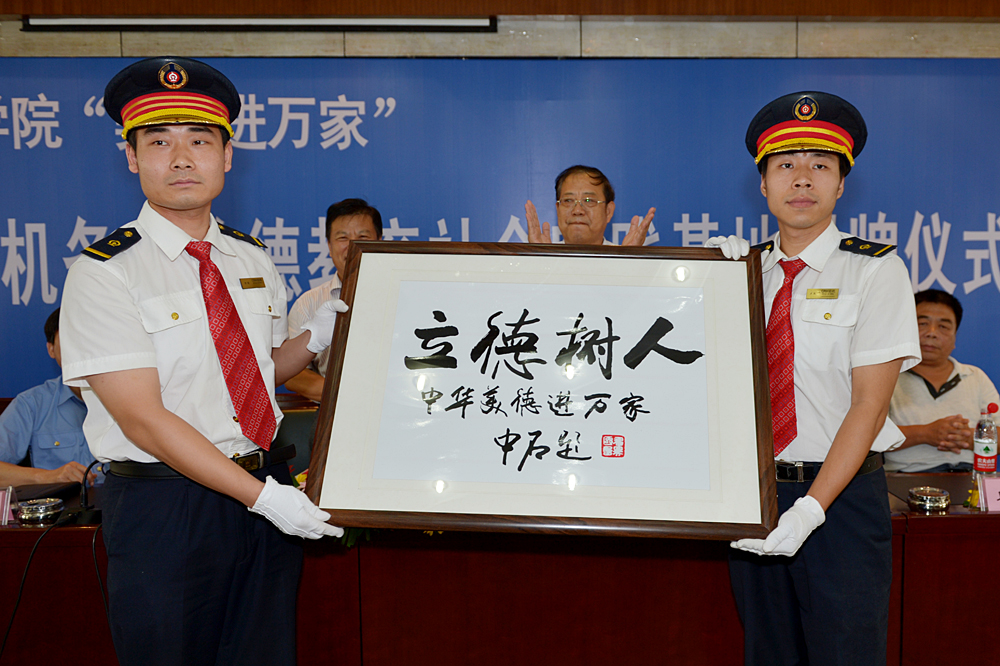 刘邦治、邓洪基代表Beplay体育官方网站向济南机务段赠送由著名学者、Beplay体育官方网站学术委员会顾问、德育导师欧阳中石先生题词《立德树人——中华美德进万家》牌匾和《中华传统美德警句名言》书籍。