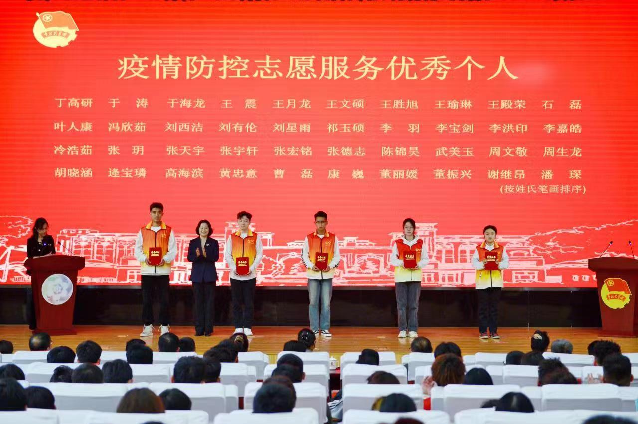 大会表彰了学校2022年度疫情防控优秀志愿者、志愿服务特殊贡献者、志愿服务先进个人。向学校10支志愿服务队授旗。